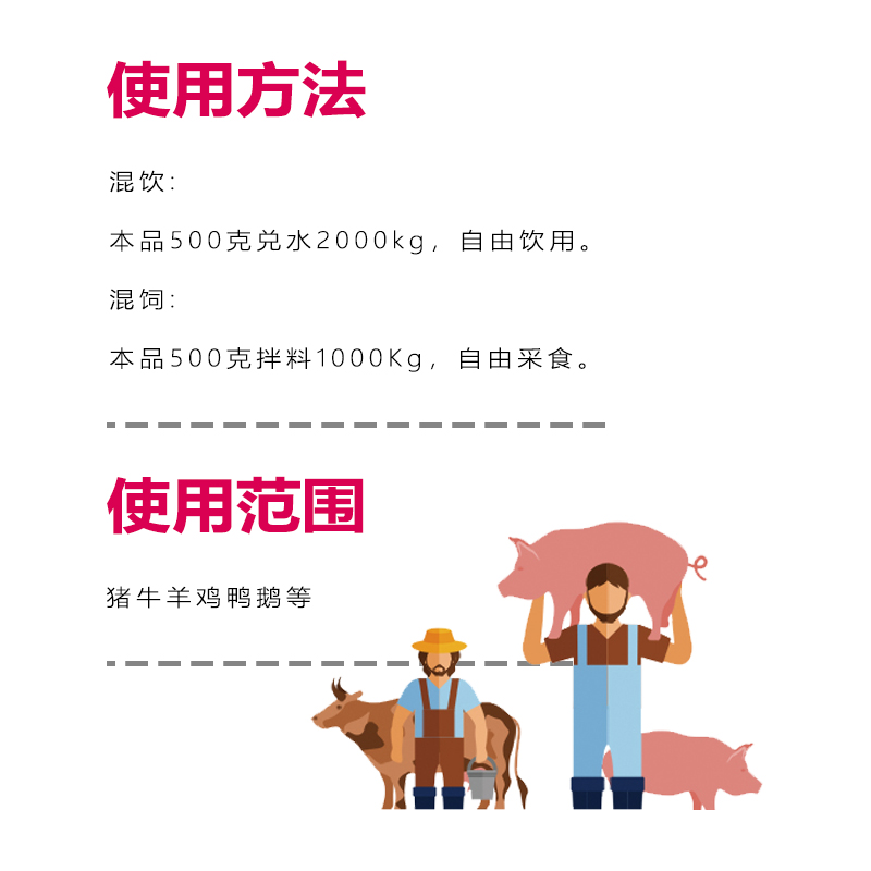 混飼:本品500克拌料1000Kg,自由采食。