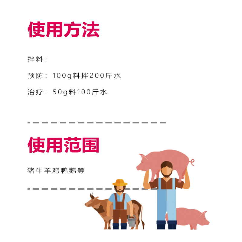 使用方法:預(yù)防:100g排料100斤,治療:100操料50斤