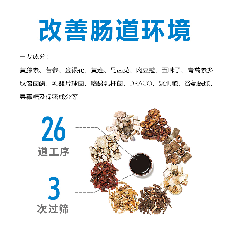 主要成份:黃藤素、苦參、金銀花、黃連、馬齒莧、肉豆蔻、五味子、青蒿索多肽溶菌酶、乳酸片球菌、諸酸乳桿菌、DRACO、聚肌胸、谷氛酰胺、果賽糖及保李成分等