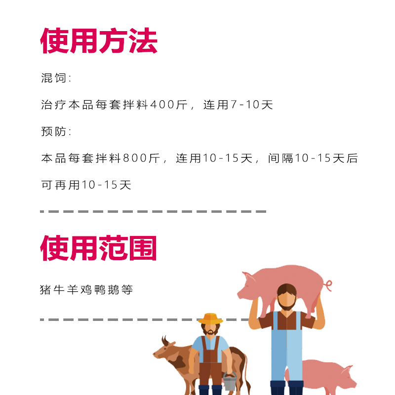 用法用量:混飼,治療:本品每套拌料400斤,豬連用5-7天,禽,連用3-5天。